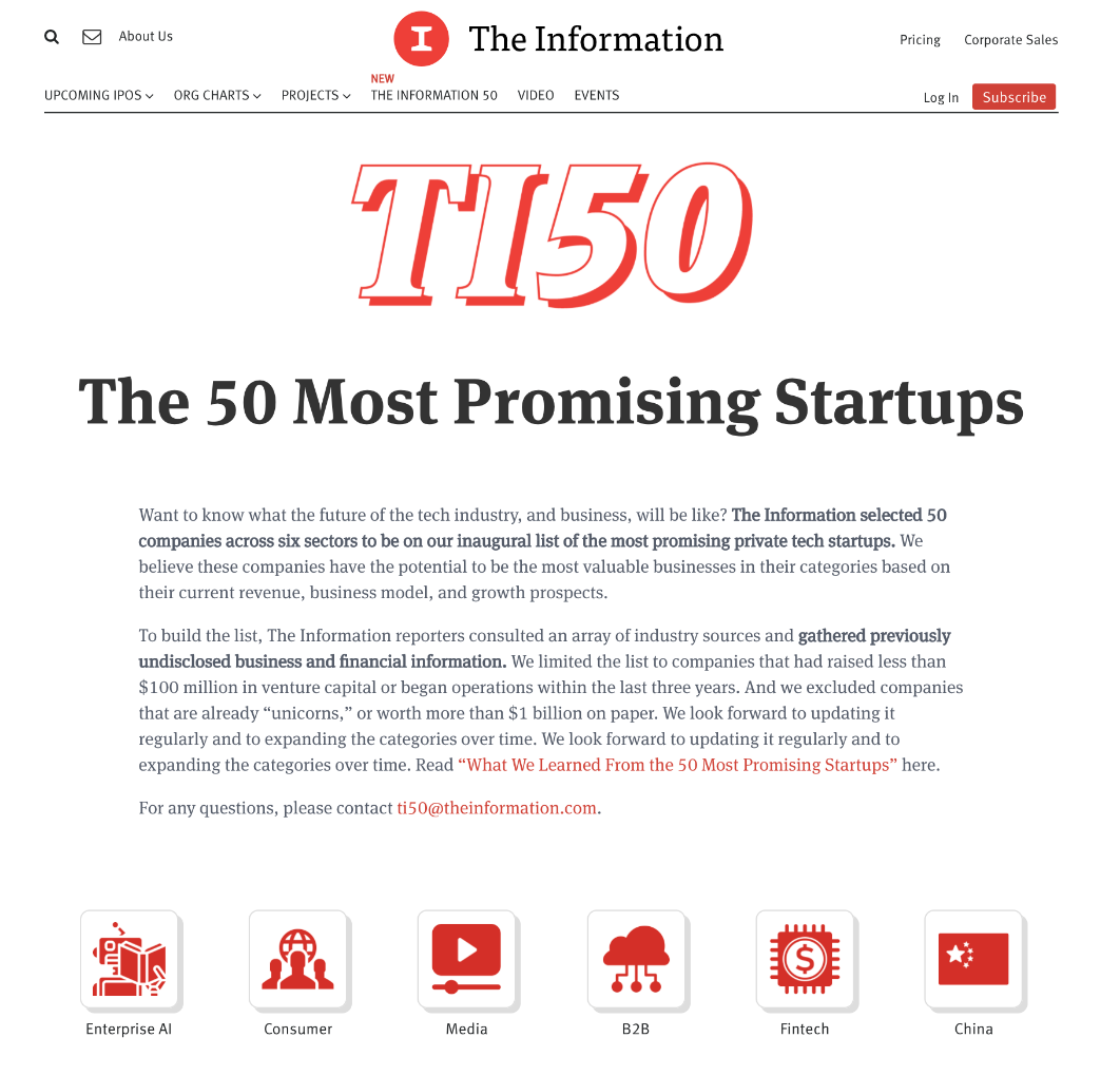 The Information is one of Silicon Valley's most influential technology media outlets. It has tens of thousands of paid subscribers in 84 countries worldwide. The "World's 50 Most Promising Startups" list is The Information's end-of-year "signature" list and one of the world's most influential startup indicators. This year's list assesses the prospects of companies in terms of business model, competitiveness and operational performance, and the finalists are considered to be the "most promising technology startups".