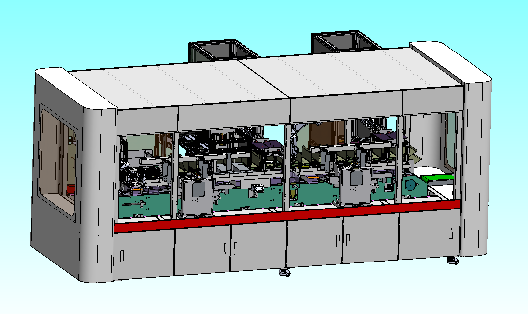 機(jī)器人開盒單元將空紙盒輸送機(jī)過來的紙盒進(jìn)行開盒,紙盒尺寸由用戶設(shè)定,機(jī)器人自動(dòng)切換不同紙盒,手套理料機(jī)通過將手套整 理后由手套入紙盒單元將手套推入紙盒中,再由扣紙盒單元將紙盒蓋扣實(shí),最后包裝好手套的紙盒通過輸送帶下線。