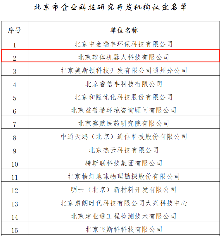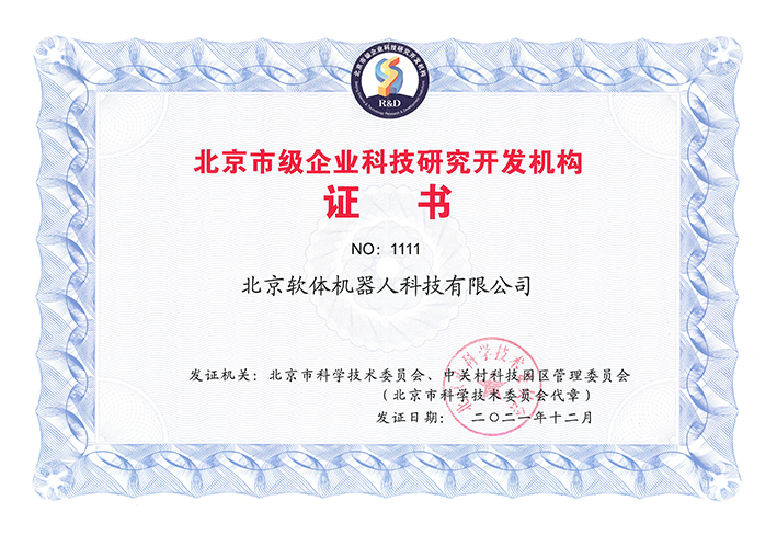 Recently, the Beijing Municipal Science and Technology Commission and the Zhongguancun Science and Technology Park Management Committee announced the "Beijing Enterprise Science and Technology Research and Development Institution Recognition List". As a pioneer of advanced technology, SRT has a complete set of technical research and development capabilities such as elastomer material technology, soft robot structure design and control technology required for soft robot technology. With its outstanding independent research and development strength, scientific and technological innovation ability, scientific and technological achievements transformation ability, etc., it has passed the strict review of Beijing Municipal Science and Technology Commission, and finally won the unanimous affirmation of experts, becoming a "Beijing-level Enterprise Science and Technology Research and Development Institution".