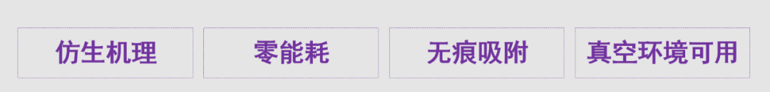VFC范德華力吸盤靈感來自于對壁虎腳掌微觀特征的觀測和模仿,通過特殊的聚合物材料和um級的表面微觀成型工藝,使吸盤能夠與各種物體表面產(chǎn)生強烈的分子間作用力,吸附力強度可達0.5kg/cm2。得益于其特殊的吸附機理,無需供電、供氣或編程,簡單可靠,能夠吸附多孔工件,甚至在真空環(huán)境下正常使用,且工件表面無印記殘留,極大的拓展了自動化設(shè)備的應(yīng)用范疇。