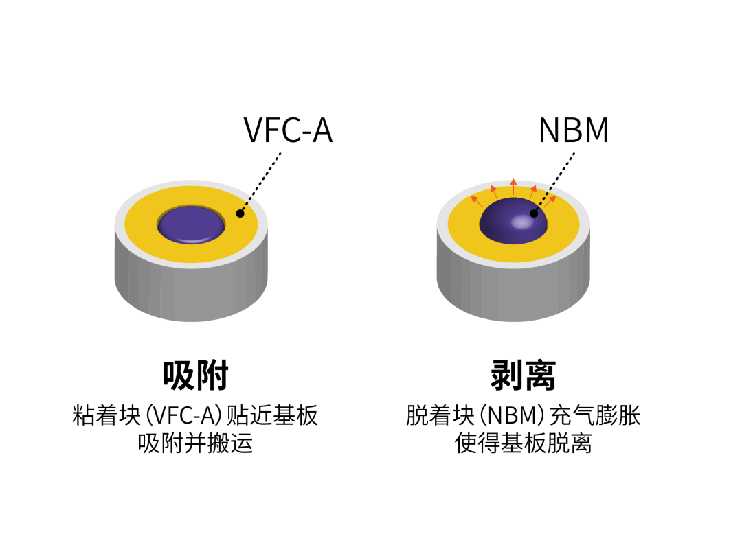 VFC-A使用原理:下料時,將NBM脫著塊進行充氣膨脹后,施力于玻璃基板,從而使基板從VFC粘著塊上剝離。