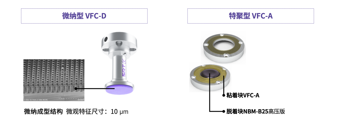 根據(jù)吸附特性,VFC范德華力吸盤主要有兩種類型,即微納型(VFC-D)和特聚型(VFC-A)。其中特聚型VFC-A范德華力吸盤的吸附力更大,在脫附時需要的脫附力就更大。