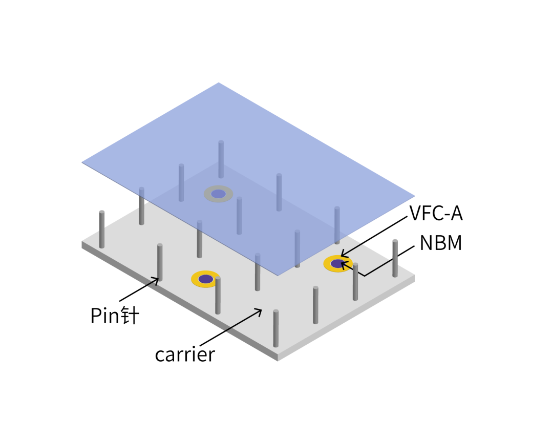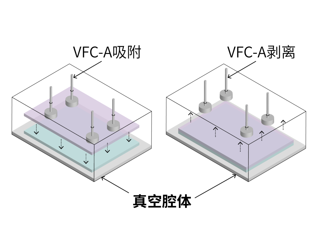 工藝流程說明:真空環(huán)境下的基板壓合工藝中,通過VFC-A吸附玻璃基板自上而下位移完成兩塊玻璃基板的貼合。
