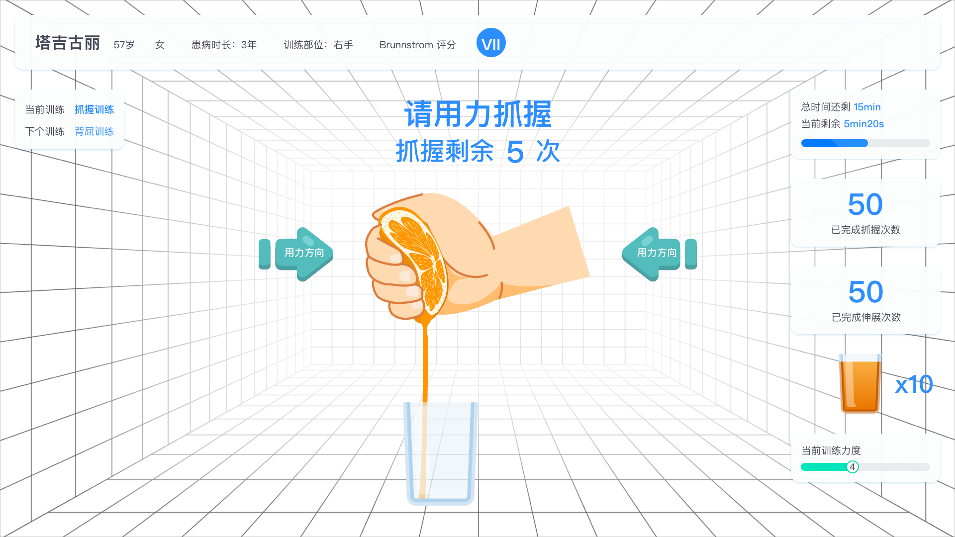 給予患者沉浸式互動體驗,通過高精度傳感器采集患者手部姿態(tài)與空間方位數(shù)據(jù),模擬手部動作。在游戲訓練中融入積分過關機制,通過結合康復理論的互動體驗來激發(fā)患者興趣,提高訓練積極性。