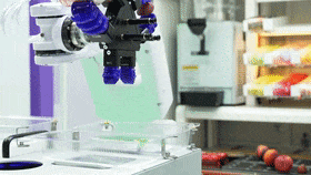 它可以根據(jù)用戶輸入的語音和文本,自主地進行圖像采集與分析,自動編排生成機器人手臂與復合仿生末端執(zhí)行器的運控指令,最后驅(qū)動機器人完成個性化的餐點推薦與配餐服務。同時,平臺搭載了數(shù)字孿生引擎,能夠通過虛實結(jié)合的形式,為觀眾展現(xiàn)AI驅(qū)動下的軟體靈巧手數(shù)字化技術(shù)的無限前景。
