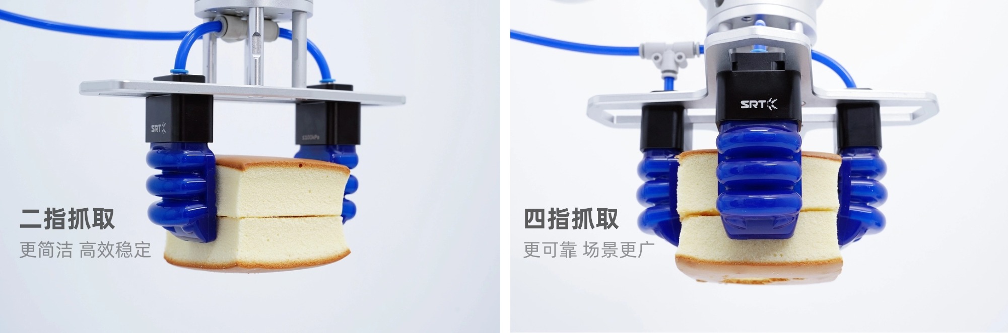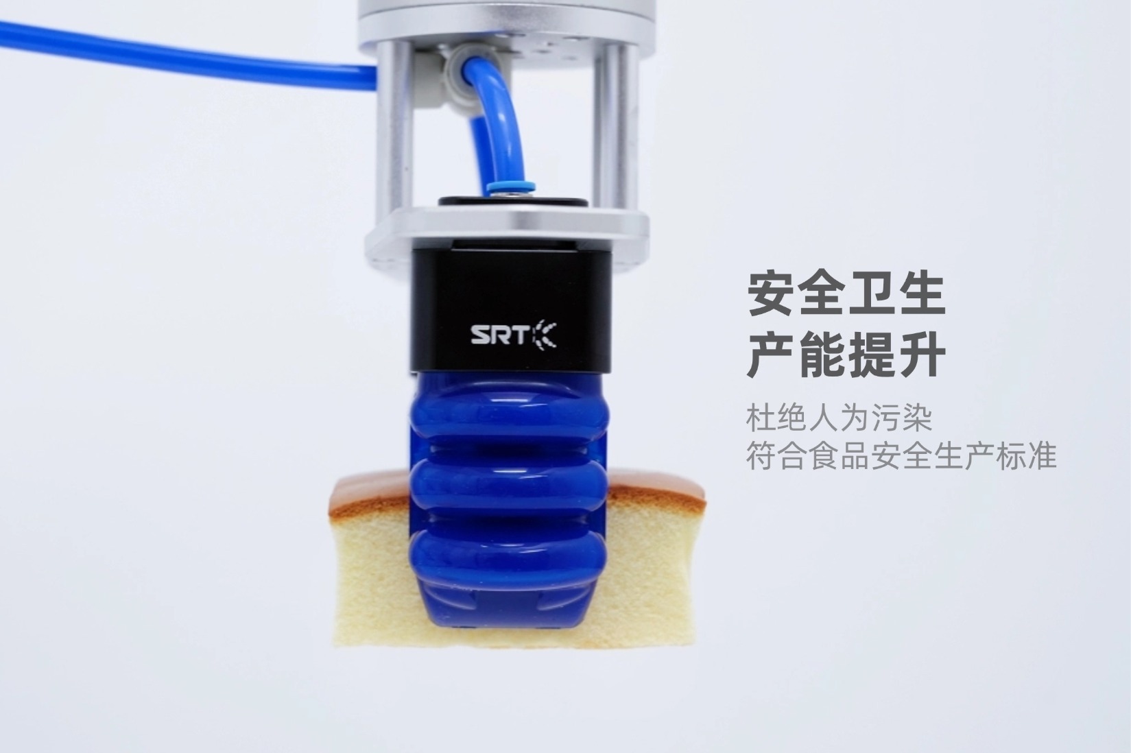 某烘焙企業(yè)專注蛋糕產(chǎn)品的規(guī)?;a(chǎn),其核心訴求是實(shí)現(xiàn)成品蛋糕從雙層堆疊到分揀環(huán)節(jié)的自動(dòng)化抓取。該類蛋糕具有柔軟怕擠壓、表面褐變皮層易刮花等物理特性,同時(shí)生產(chǎn)過(guò)程需滿足食品級(jí)衛(wèi)生、高速連續(xù)作業(yè)、低損耗的要求,這讓傳統(tǒng)自動(dòng)化方案陷入兩難——人工抓取效率低且存在衛(wèi)生風(fēng)險(xiǎn),常規(guī)剛性?shī)A爪與真空吸盤(pán)方案則頻繁導(dǎo)致產(chǎn)品破損、表面污染,成為制約產(chǎn)能升級(jí)的關(guān)鍵瓶頸?;诜律鷮W(xué)原理和軟體機(jī)器人技術(shù)的SRT柔性末端執(zhí)行器,通過(guò)針對(duì)性的技術(shù)適配,為該客戶實(shí)現(xiàn)了“無(wú)損、高效、合規(guī)”的自動(dòng)化升級(jí)。